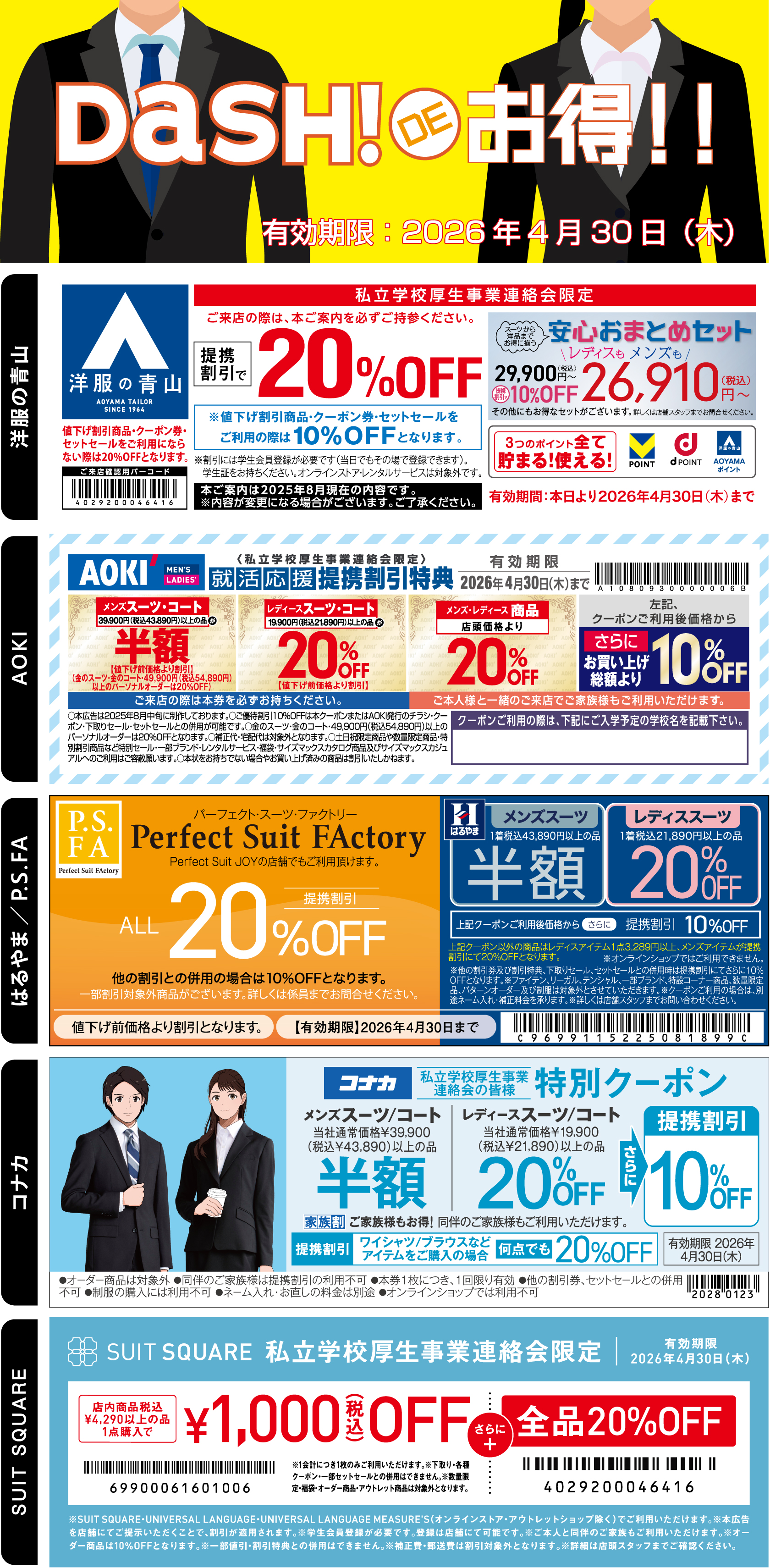 サービスカウンター店頭に特別割引クーポン券があります。是非ご利用ください。 今すぐ使える就活クーポンはこちらをクリック!御家族・教職員様もご利用出来ます。 |